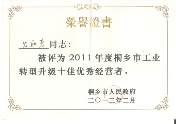會上公布了2011年度表彰名單,我公司被評為“2011年度桐鄉(xiāng)市工業(yè)轉(zhuǎn)型升級十大突出貢獻(xiàn)企業(yè)”、“國家級安全生產(chǎn)標(biāo)準(zhǔn)化企業(yè)”。公司下屬子公司桐鄉(xiāng)上升膠帶有限公司被評為“2011年度桐鄉(xiāng)市出口十強(qiáng)企業(yè)”。同時,公司董事長沈耿亮榮獲“2011年度桐鄉(xiāng)市工業(yè)轉(zhuǎn)型升級十大優(yōu)秀經(jīng)營者”榮譽(yù)稱號。