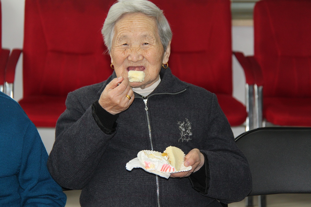 隨后,兩位壽星代表一起上臺(tái),與大家齊唱生日歌,在祝福聲中吹滅蠟燭,笑的像孩子般開心,大家一起吃蛋糕,共同分享著這份喜悅和幸福。看著眼前的蛋糕,聽著像自己子女一樣的生日歌聲,老人們很感動(dòng)。